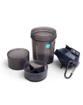 Smartshake Original 2Go -shaker sisältää kaksi erillistä säiliötä: pienempi, pohjaan kiinnittyvä säilytystila irroitettavalla jakajalla, jonka avulla jaat tilan helposti 4 erilliseen lokeroon esimerkiksi kapseleita ja tabletteja varten, & tilavampi lokero, johon mahtuu esimerkiksi reilumpi annos palautusjuomajauhetta. Irroitettava suodatinverkko takaa sen, että juomasta tulee samettisen pehmeää ja juomasekoituksiin ei pääse muodostumaan paakkuja. Shakerin kierrekansi pysyy kiinni tiiviisti, ja napsautettava korkki helpottaa ja nopeuttaa juomista. Kannessa on lisäksi kestävä karabiinihaka, jolla pullon voi kiinnittää esimerkiksi vyölle tai laukun ulkopuolelle, jolloin shaker ei vie tilaa treenikassin sisältä.