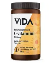 Vida C-vitamiini 500 mg, 90 tabl. on vahva ja pitkävaikutteinen C-vitamiinivalmiste vastustuskyvyn ylläpitoon! C-vitamiini edistää immuunijärjestelmän normaalia toimintaa ja lisäksi se parantaa ihon, hiusten ja kynsien hyvinvointia ylläpitämällä normaaliia kollageenin tuotantoa. Jokainen tabletti sisältää 500 mg C-vitamiinia (L-askorbiinihappoa). Kun Vida C-vitamiini tabletin ottaa aamulla, siitä vapautuu jopa noin 8 tunnin ajan tabletin nauttimisesta vitamiinia elimistön käyttöön.