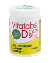 Vitatabs D-Caps, 200 kaps. Syö juustoa, se kasvattaa luustoa sanotaan, mutta jos juustot, vitaminoidut maitovalmisteet ja rasvainen kala eivät kuulu ruokavalioosi on syytä napata luuston tueksi D-vitamiini purkista, jotta varmistat sen riittävän saannin. Itse asiassa pohjoisen pimeän talven aikana on Vitatabs D-Caps fiksu valinta lähestulkoon jokaiselle. Onhan aurinko, paras D-vitamiinin lähde, piilossa pitkän aikaa.